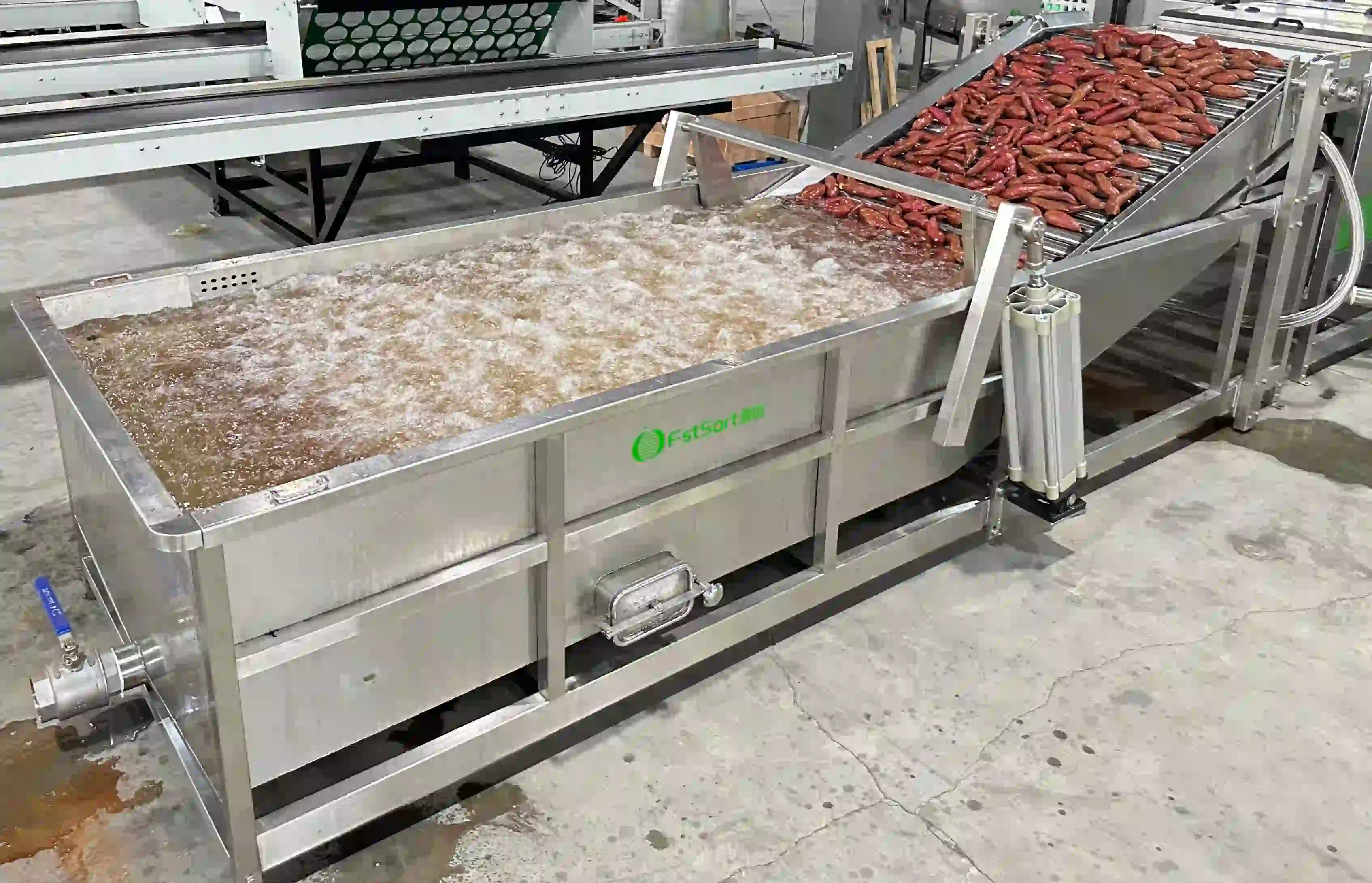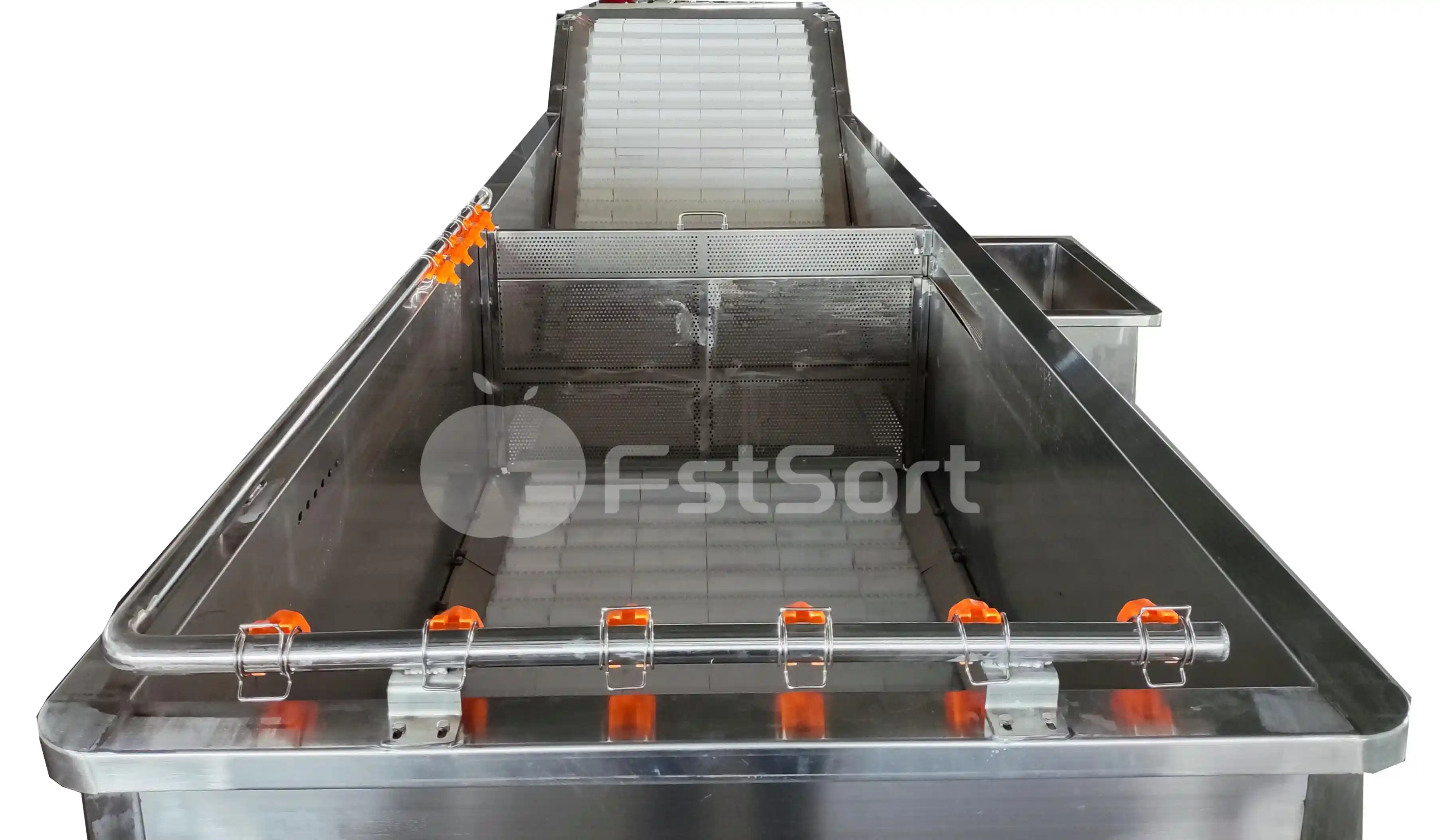 Fstsort bubble washer β configurable for any crop. Start with standard design for tomatoes, citrus, apples. Add rear spray for floating crops (bell peppers). Upgrade with filter screen + high-pressure sprays for nuts, or pneumatic lift + roller elevator for root crops. 3β5m length, 800β1200mm width. SUS304. Get quote.
