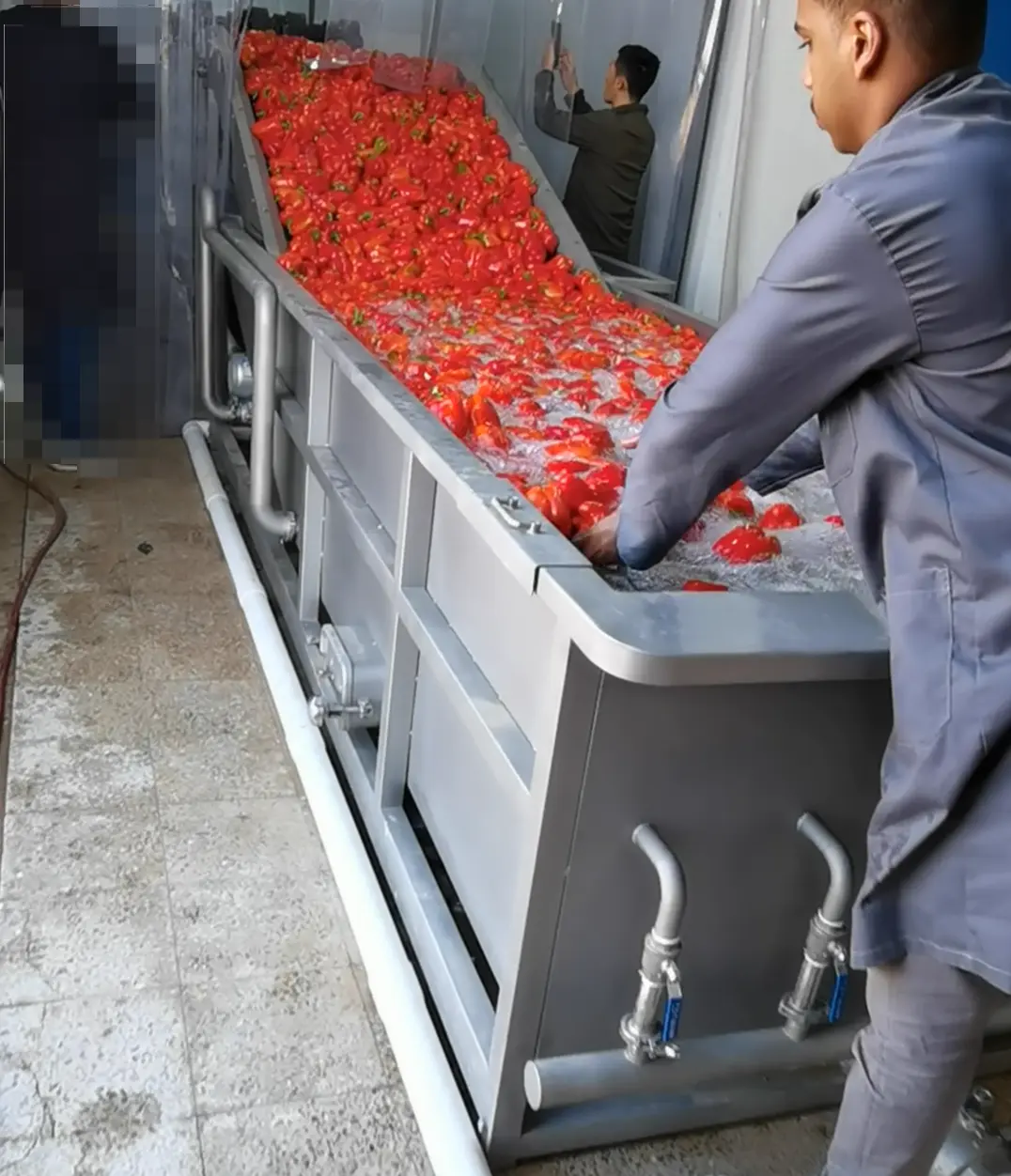 1 | Produce enters the water tank via elevator or conveyor |