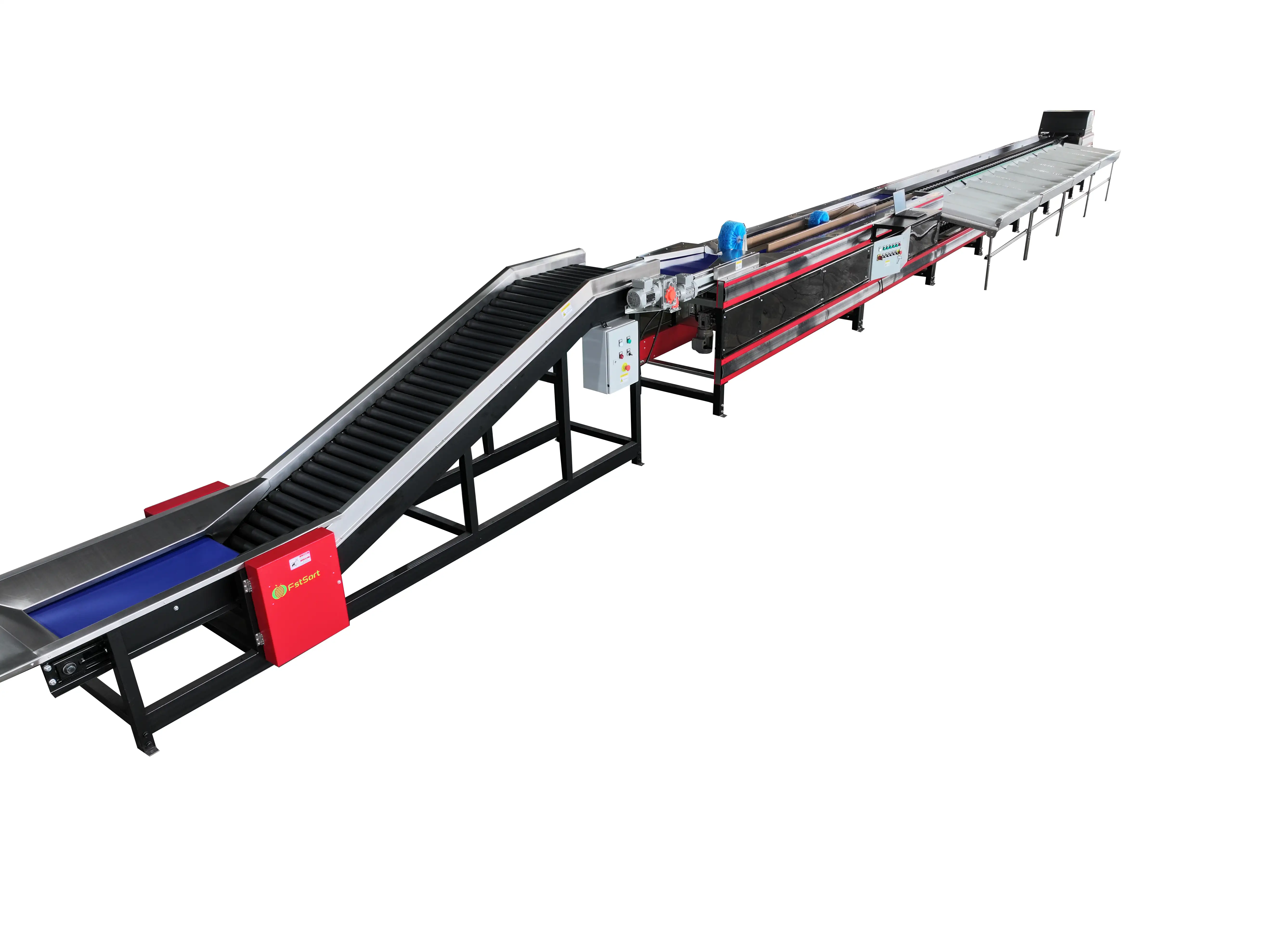 Este sistema de calibrado rotatorio Fstsort incluye un elevador, una cinta transportadora, la unidad principal de clasificación electrónica y el panel de control. Puede clasificar diversas frutas y verduras por peso mediante control computarizado. Es compacto y perfecto para líneas de envasado de melocotón de pequeña y mediana escala.