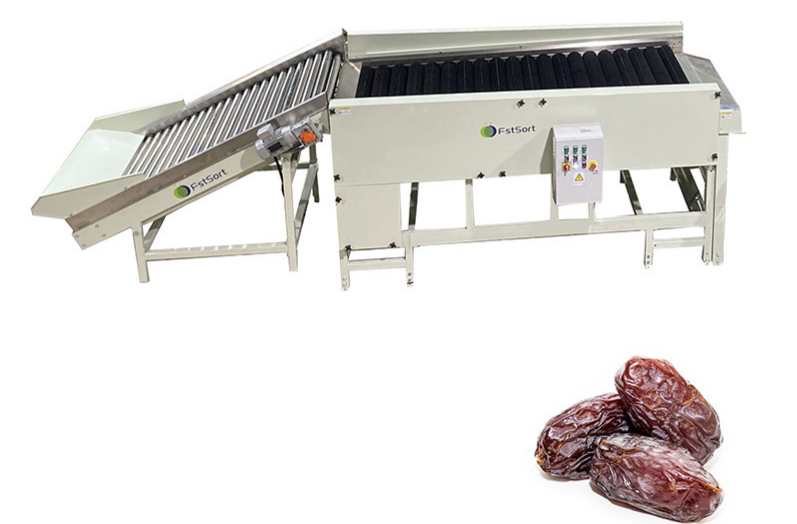 This Fstsort dates grading sizing machine consists of a hopper & elevator, roller inspection table, and grading part. It is used for sorting and grading fruits by diameter. Stainless steel rollers rotate on the inspection table for manual quality sorting.